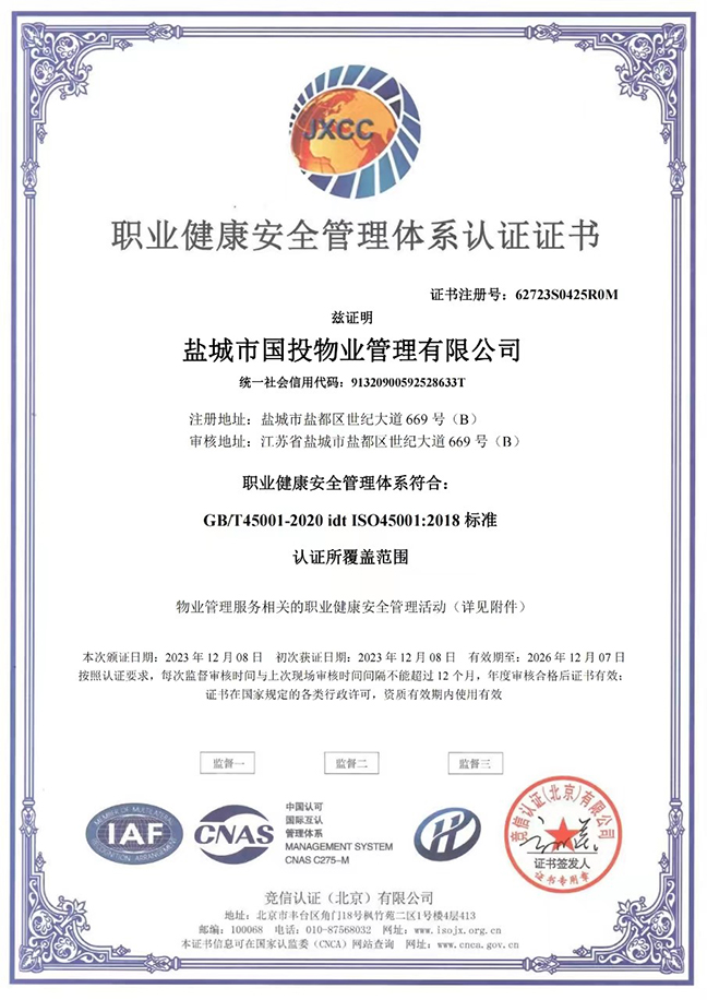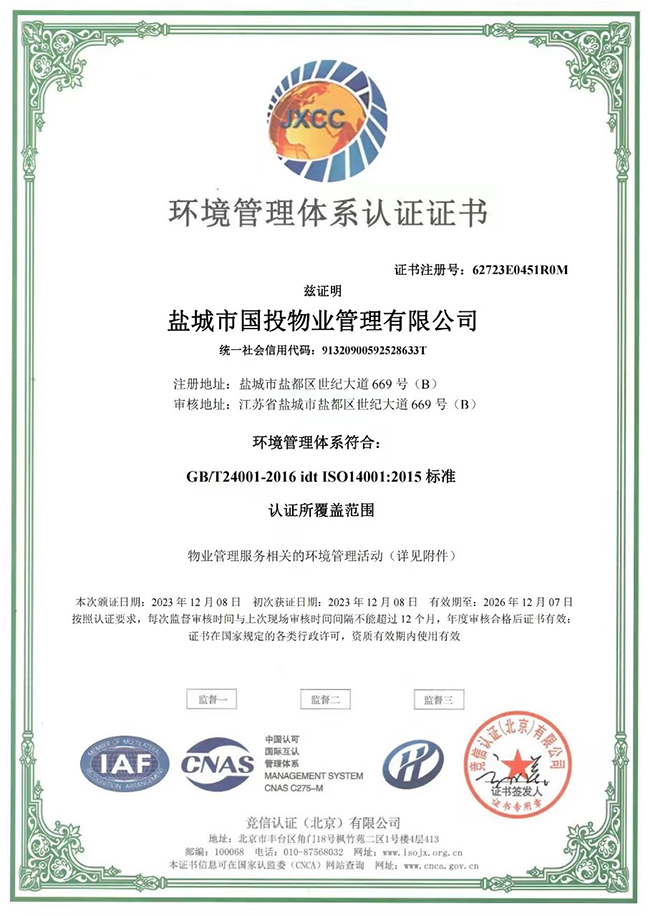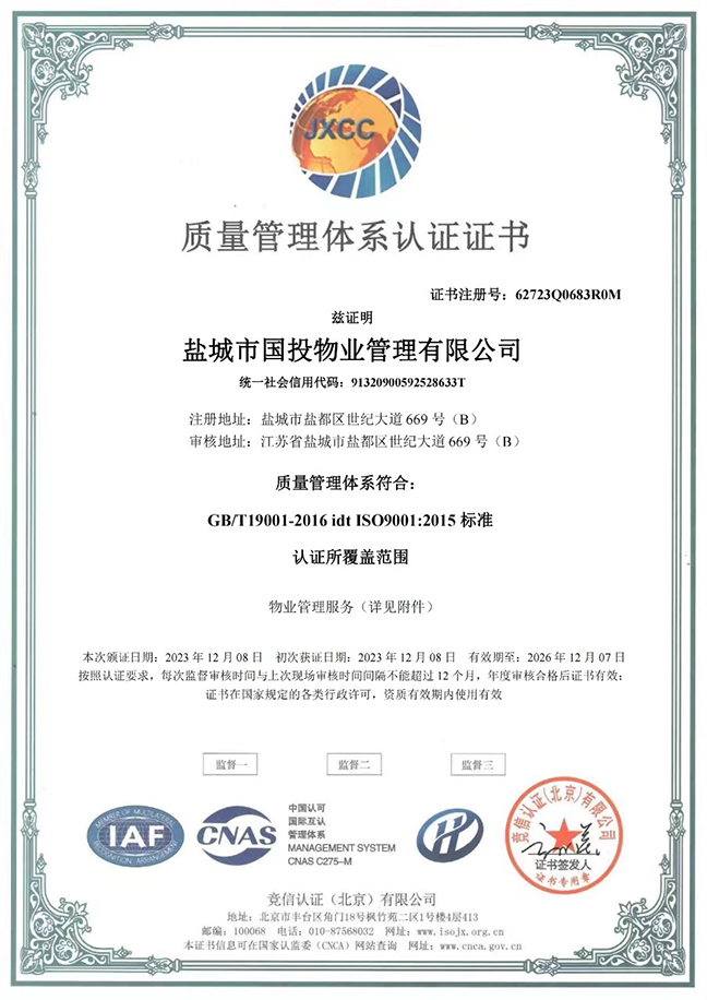 日前,鹽城國投物業(yè)公司順利取得ISO“三體系”(ISO9001質(zhì)量管理體系、ISO14001環(huán)境管理體系、ISO45001職業(yè)健康安全管理體系)認(rèn)證證書。這是公司在提升企業(yè)綜合實力過程中取得的新進(jìn)展,標(biāo)志著公司在精細(xì)化、制度化、規(guī)范化管理方面邁上新臺階。