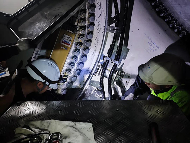 面對復(fù)雜海況,運(yùn)維團(tuán)隊同步完成多項(xiàng)關(guān)鍵作業(yè):對#01、#04風(fēng)機(jī)蓄能器支架實(shí)施技改以提升設(shè)備穩(wěn)定性;快速處理#19風(fēng)機(jī)偏航液壓站缺陷以恢復(fù)風(fēng)機(jī)運(yùn)行;在顛簸的船上和高空機(jī)艙內(nèi),團(tuán)隊將“精益運(yùn)維”落實(shí)到每個細(xì)節(jié)。