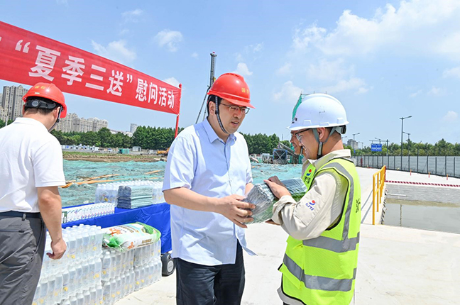 在大數(shù)據(jù)交通指揮中心項目現(xiàn)場,張林海與奮戰(zhàn)在高溫一線的施工人員親切交談,關(guān)切詢問防暑降溫、日常工作等情況,對他們不畏高溫、堅守崗位的精神給予充分肯定,并將防暑物資一一送到他們手中,叮囑大家在工作中要做好自我防護(hù)、注意勞逸結(jié)合、保證自身安全。
