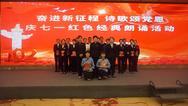 為慶祝中國共產(chǎn)黨成立102周年,弘揚偉大建黨精神,抒發(fā)愛黨愛國情懷,6月29日下午,鹽城國投大酒店黨支部聯(lián)合國投中科黨支部以“奮進新征程 詩歌頌黨恩”為主題,開展了慶“七一”紅色經(jīng)典誦讀活動。