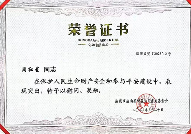 目前,鹽城市鹽南高新區(qū)見(jiàn)義勇為基金會(huì)已向周紅星頒發(fā)榮譽(yù)證書(shū),表彰其在危急時(shí)刻挺身而出的助人行為。